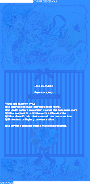 ♥ Borraremos los textos "COPIAR DESDE AQUI", "HASTA AQUI" y Reglas (no borrar el botón de Layouts Gratis). Comenzaremos a rellenar el layout con el contenido que queremos compartir sobre nosotras y validamos. ♥ Para ver si está todo bien colocado, pueden cerrar sesión y visitar su dollz.